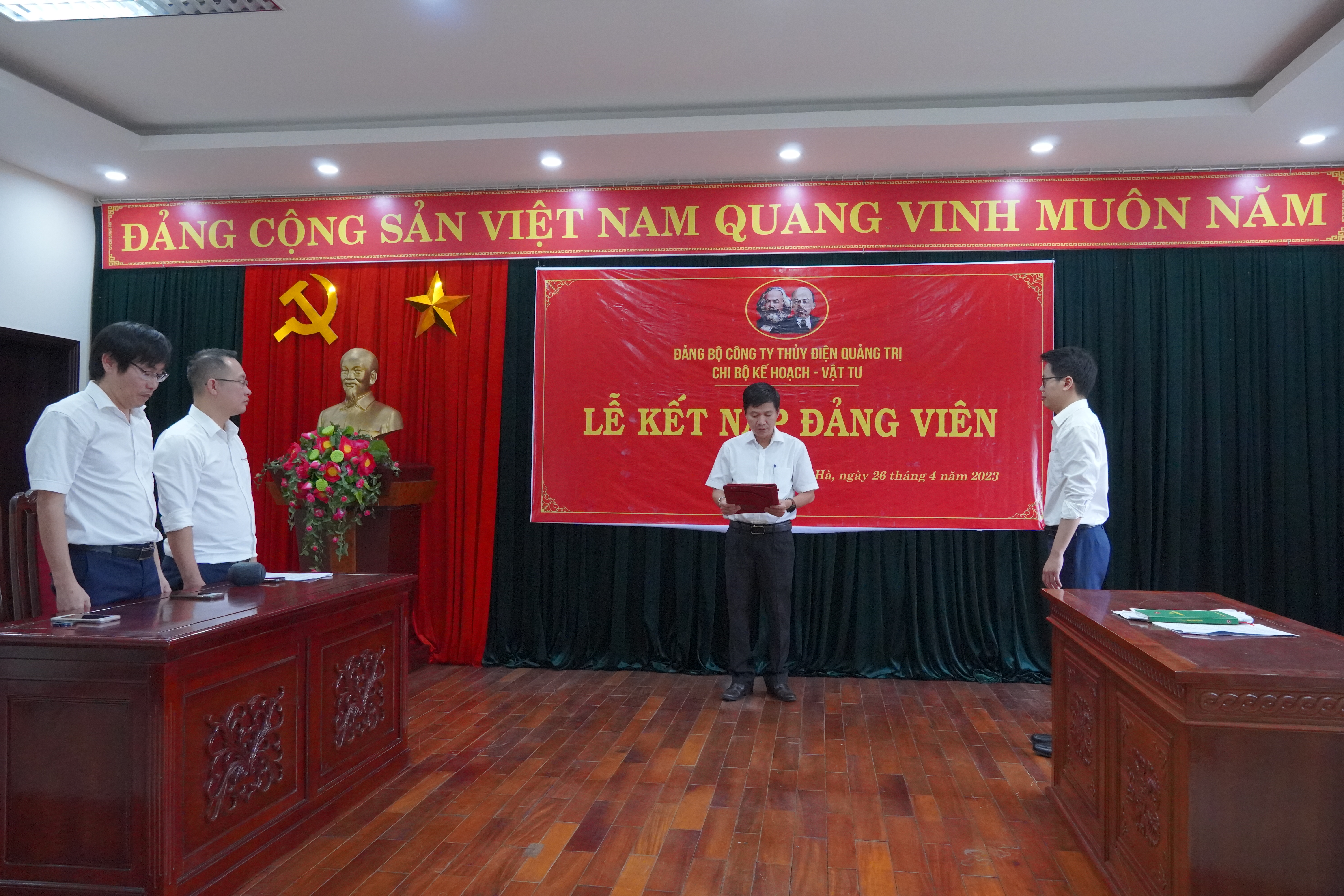 Ngày 26/4/2023, tại Văn phòng Đông Hà, được sự đồng ý của Đảng ủy Công ty Thủy điện Quảng Trị, Chi bộ Kế hoạch - Vật tư đã tổ chức Lễ kết nạp đảng viên cho đồng chí Nguyễn Thanh Việt.