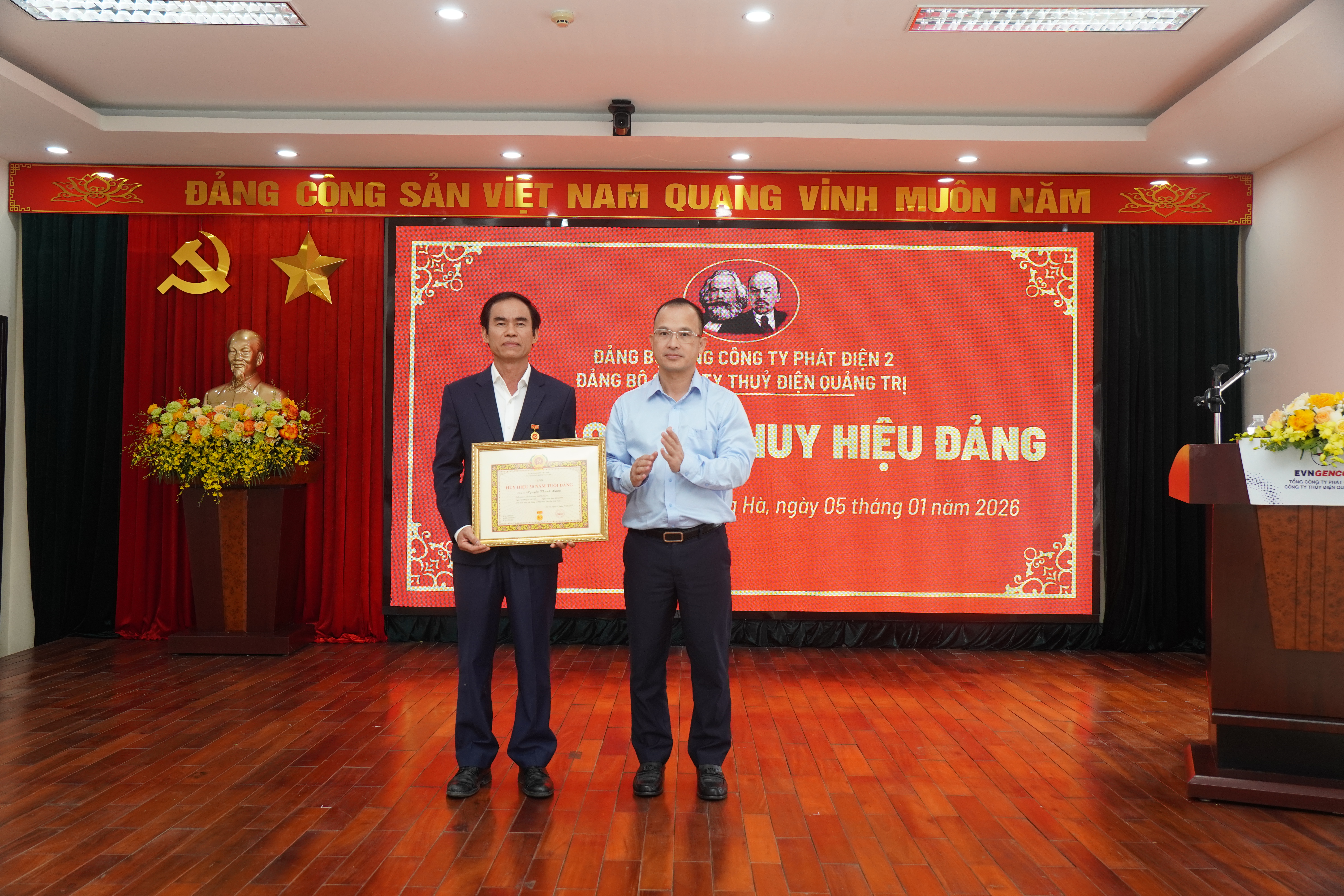 Đồng chí Nguyễn Hữu Thịnh - Phó Bí thư Đảng ủy EVNGENCO2 trao huy hiệu 30 năm tuổi Đảng cho đ/c Nguyễn Thanh Hùng - Bí thư Đảng ủy, Giám đốc Công ty TĐQT